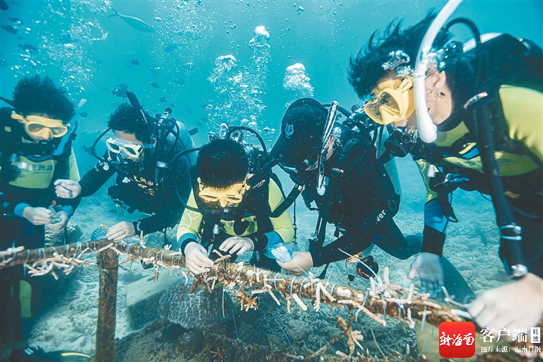 三亚蜈支洲岛旅游区全日托管营把课堂搬进了大海,孩子们跟着潜水教练潜入海底,亲手移种珊瑚。受访者供图