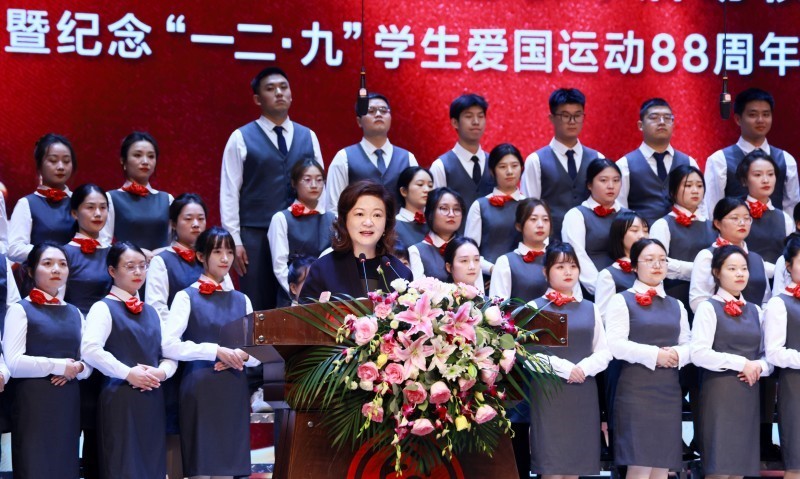 党委书记、政府督导专员高华锦讲话。她指出,作为新时代爱国青年,缅怀、纪念“一二·九”就是要发扬和光大爱国主义精神,竭尽努力,建设社会主义现代化强国,实现中华民族的伟大复兴。她向同学们提三点希望。一是高扬民族精神,坚定青春理想。青年学生要奋力弘扬以爱国主义为核心的民族精神,勇敢承担新时代中国特色社会主义建设的伟大使命,在今后的工作、学习中坚定理想信念,培养高尚人格,树立远大目标,让青春在为国家、为人民的奉献中焕发出炫丽光彩。二是锤炼高尚品德,彰显青春风采。青年学生要善于从中华民族传统美德中汲取道德滋养,积极向时代楷模看齐,在努力学习好专业知识的同时,加强道德修养,培养家国情怀,积极参加社会实践活动,让自己成为一名德智体美劳全面发展的新时代新青年。三是砥砺奋斗意志,展现青春作为。青年学生要不负青春,珍惜韶华,勇做走在时代前列的奋进者、开拓者、奉献者,要积极学习科学文化知识,要坚持创新创造,发扬年轻人敢拼敢闯、敢作敢为的精气神,在实现中国梦的生动实践中放飞青春梦想,在为人民利益的不懈奋斗中书写人生华章!