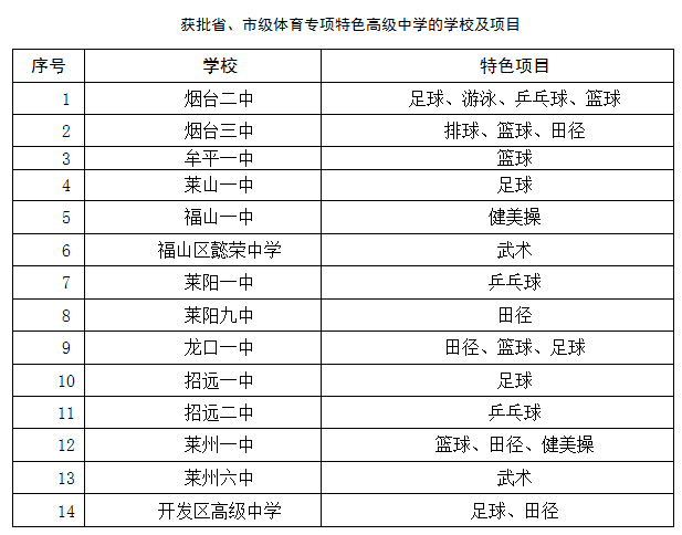 烟台二中、烟台三中、莱山一中、牟平一中、牟平育英艺术中学、福山一中、海阳一中、蓬莱一中、龙口一中、招远一中、开发区高级中学等获批市级艺术特色学校称号的11所普通高中,可根据学校艺术特色项目建设需求,在全市范围内招收艺术特长生。
