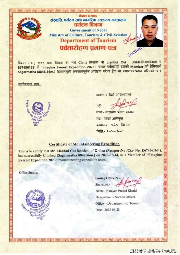 泰国格乐大学体育教育硕士学生崔连晖,于2023年5月14日成功登顶珠穆朗玛峰(经南坡攀登),并于6月23日予以签发登顶证书。