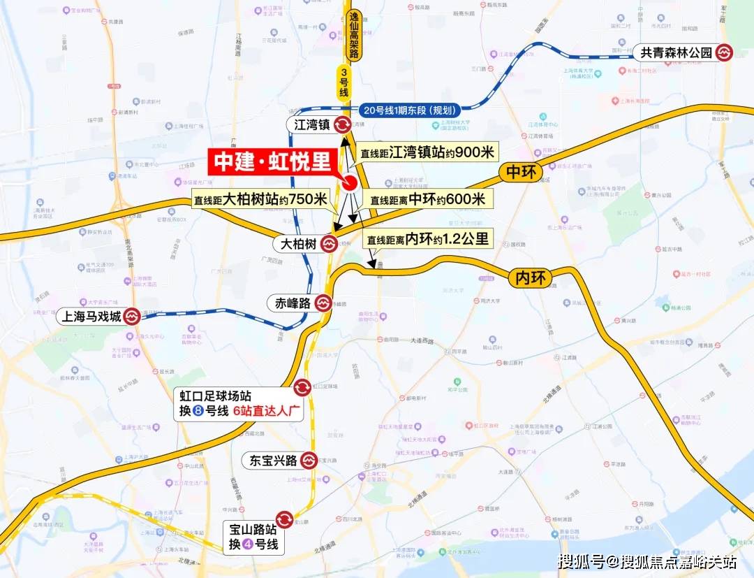 轨交配套:与3号线大柏树站、江湾镇站直线米,畅联中山公园/延安西路;三重高架:临近中环高架/逸仙高架及大柏树立交,迅捷衔接五角场/大宁等地;干道交通:周边汇聚逸仙路/汶水路/中山北路等城市主干道,便捷抵达全城。