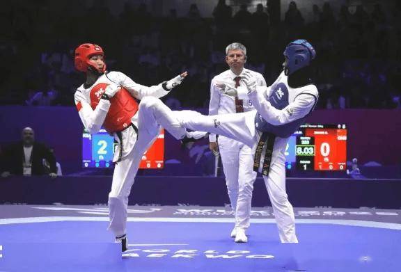 图为10月30日在江苏无锡举行的一场2025年世界跆拳道锦标赛比赛。新华社发(刘臻睿摄)