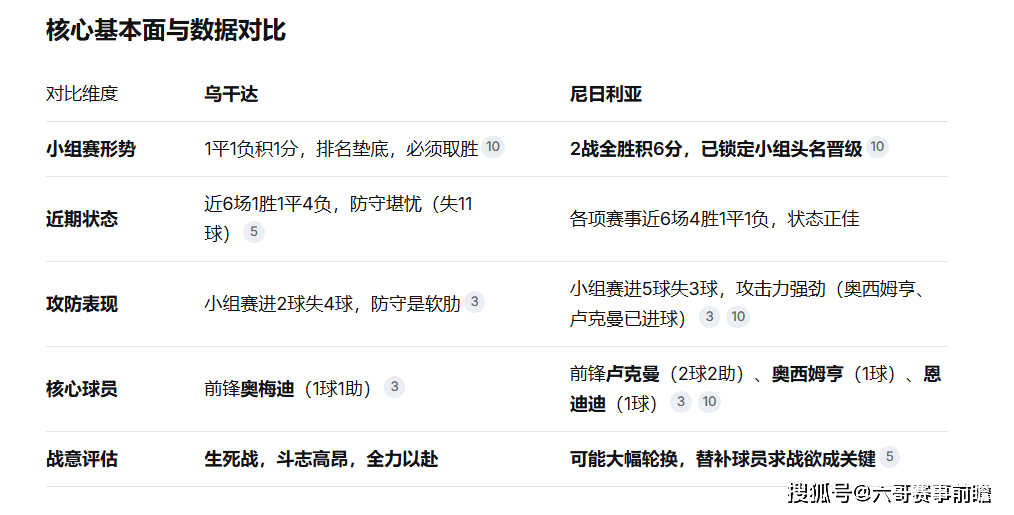 本场比赛是典型的“为荣誉/生机而战”对阵“无欲无求”。乌干达两战仅积1分,此役必须取胜才有渺茫的出线希望。而尼日利亚两战全胜已提前锁定小组头名晋级,战意与阵容轮换成为最大变数。