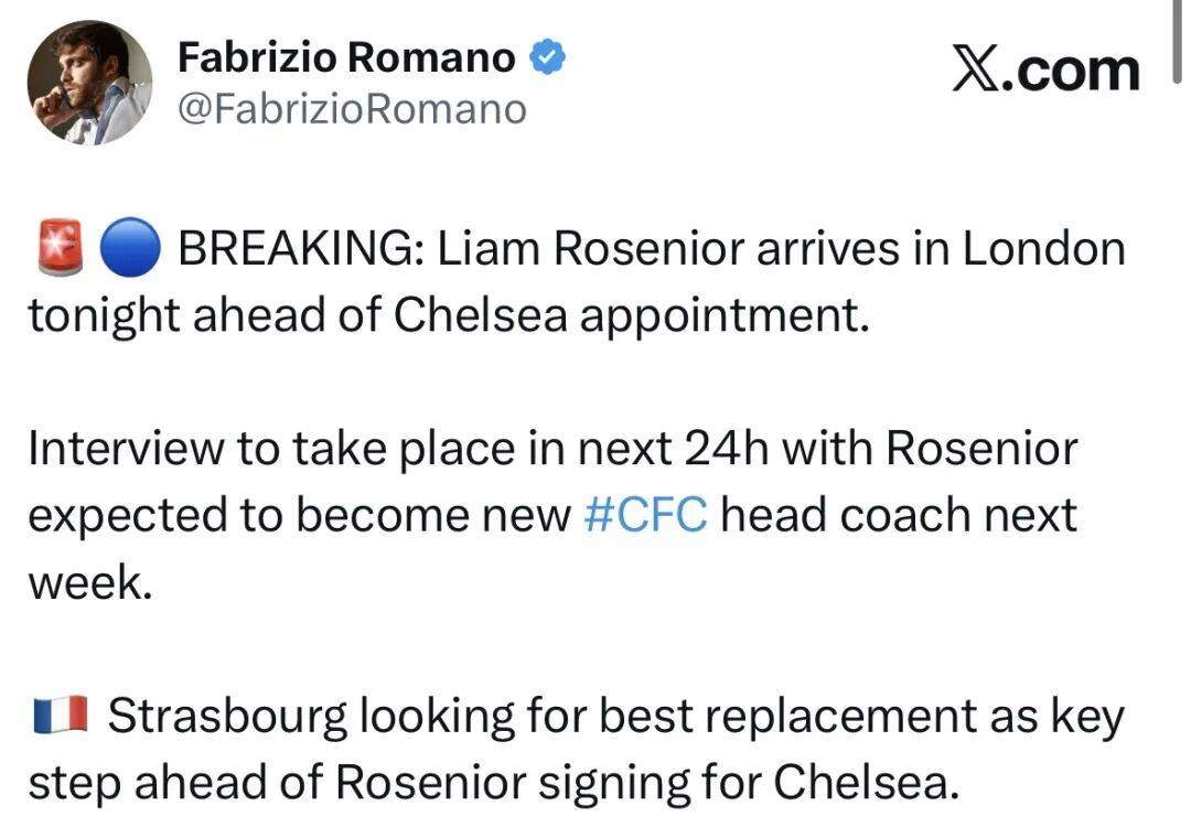 据悉,斯特拉斯堡主帅罗塞尼尔已于当地时间周日飞抵伦敦,就接替马雷斯卡出任切尔西主帅一职进行深入谈判。