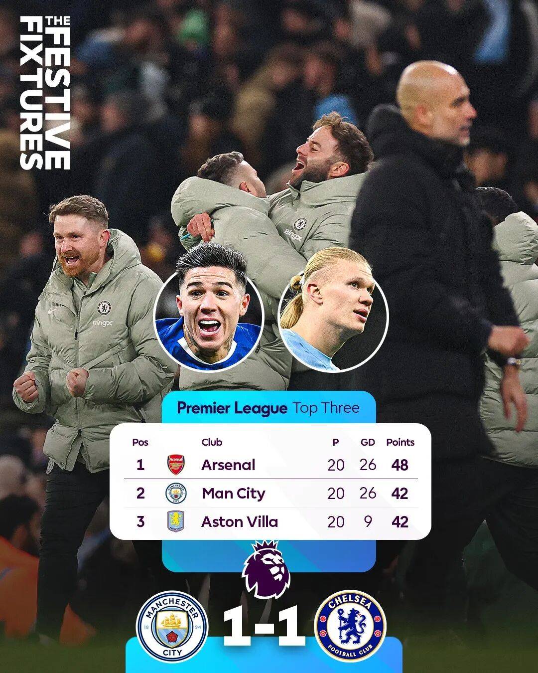 落后的切尔西一直到伤停补时阶段才扳平比分,古斯托突破边路传中,恩佐-费尔南德斯攻入关键一球。最终,曼城在主场遭遇蓝军绝平。