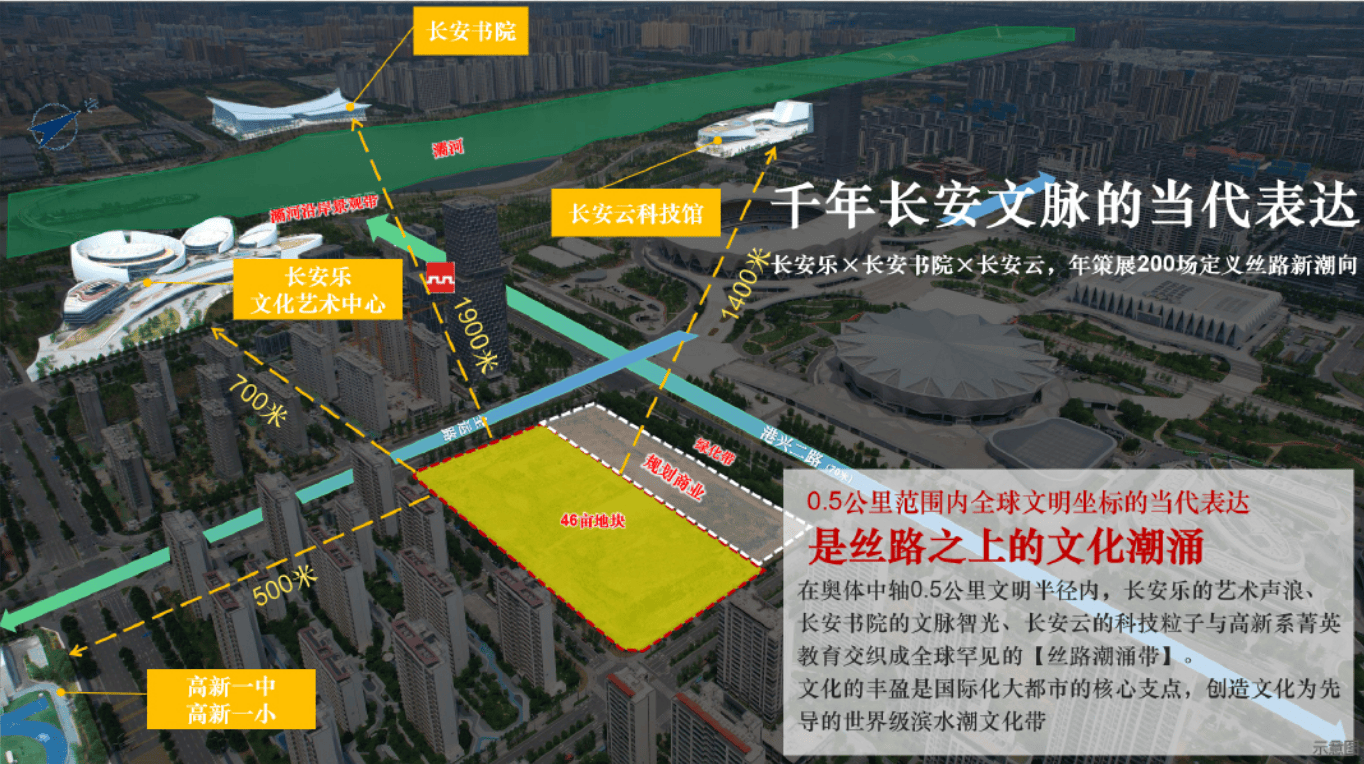在樊体中轴长安乐的艺术声浪、长安书院的文脉智光、长安云的科技粒子与高新系菁英教育交织成全球罕见的【业路潮涌带】文化的丰盈是国际化大都市的族心支点,创造文化为导的世界级滨水潮文化带