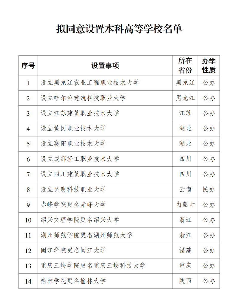 教育部拟同意设置黑龙江农业工程职业技术大学等14所本科高等学校。