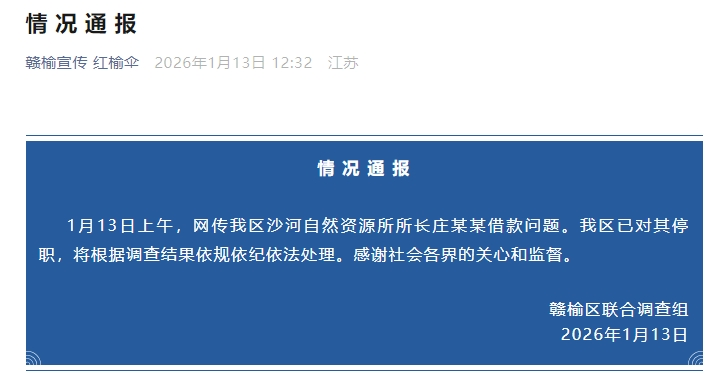 连云港赣榆区通报“国土所所长被指借款68万元迟迟不还”:停职调查。