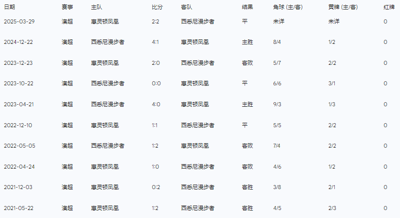 通过上表可以观察到,西悉尼漫步者在主场面对惠灵顿凤凰时通常具备极强的爆发力,曾在2023和2024年两次大胜对手。然而,双方在过去六场比赛中有三场以平局收场,平局率高达50%,这表明了在现代澳超体系下,双方的战术限制越来越强 。