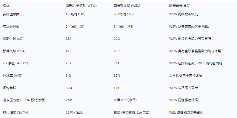 西悉尼漫步者的预期进球数为 23.1,但实际仅打入 13 球,这意味着他们浪费了近 10 个预期进球的机会 。这种巨大的负向偏差在职业足球中通常被视为统计学上的“回归诱因”,即进球数的爆发可能在近期发生。与此形成鲜明对比的是惠灵顿凤凰,其实际失球数(31球)略高于预期失球数(29.7球),这表明其防线确实存在系统性崩溃的问题 。