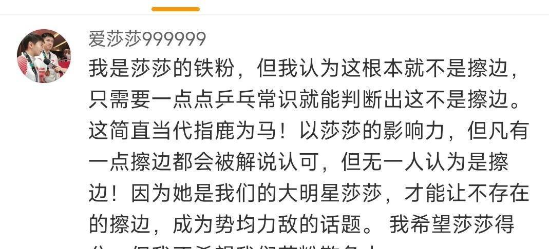这场风暴中,一个被称为“正义莎粉”的声音显得格外清晰。 一位自称是孙颖莎铁杆粉丝的网友公开表示:“我是莎莎的铁粉,但我认为这根本就不是擦边,只需要一点点乒乓常识就能判断出这不是擦边。 ”